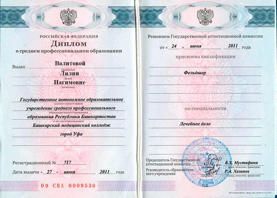 • 2011 – ГАОУ СПО Республики Башкортостан "Башкирский медицинский колледж" – диплом по специальности "лечебное дело".